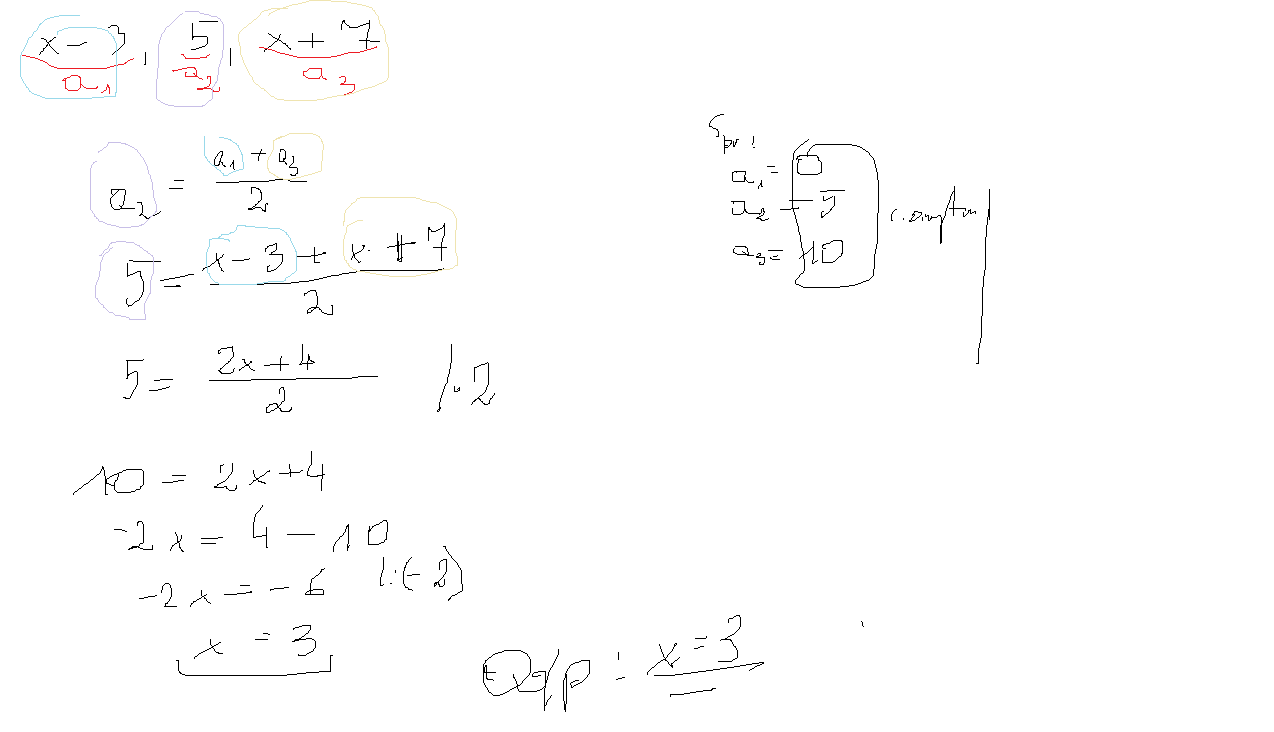 Wyznacz x,jezeli liczby x-3,5 , x+7 sa pierwszymi,drugimi i trzecim wyrazem ciagu arytmetycznego.Oblicz x.