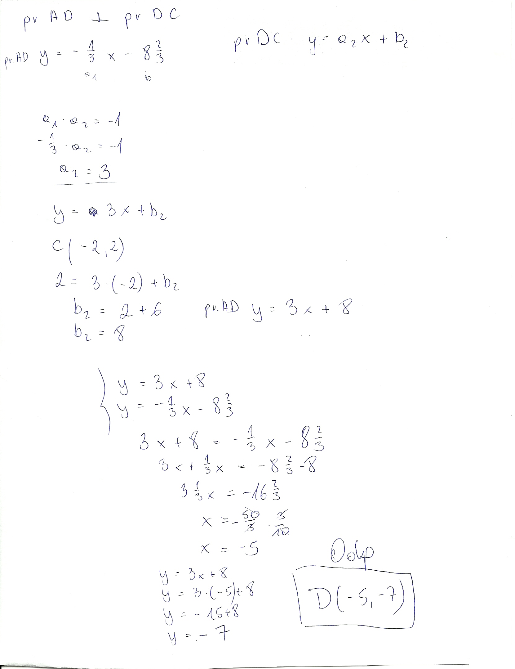 Punkty o współrzędnych A = (-2,-8), B = (2,4), C = (-2,2) są wierzchołkami trapezu. Ramie trapezu AD jest prostopadłe do podstaw AB i CD. Oblicz współrzędne punktu D oraz pole powierzchni tego trapezu.
