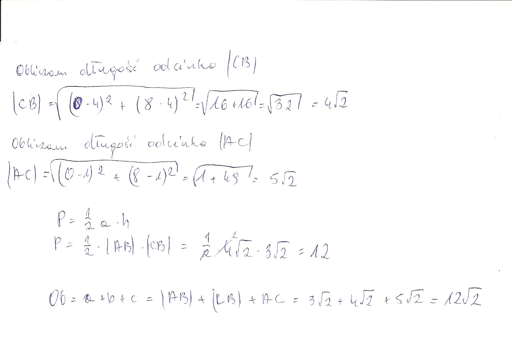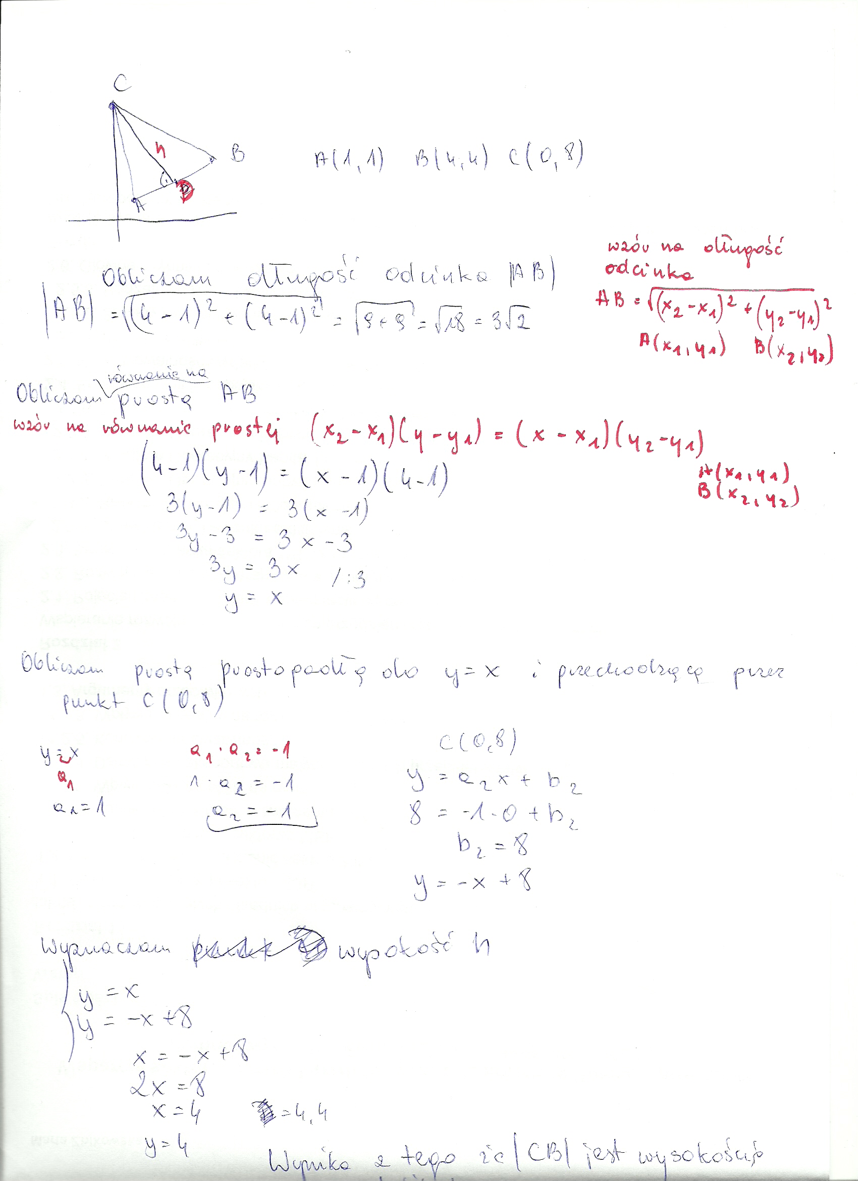 oblicz obwód i pole trójkąta o wierzchołkach A=(1;1) B=(4;4) C=(0;8)