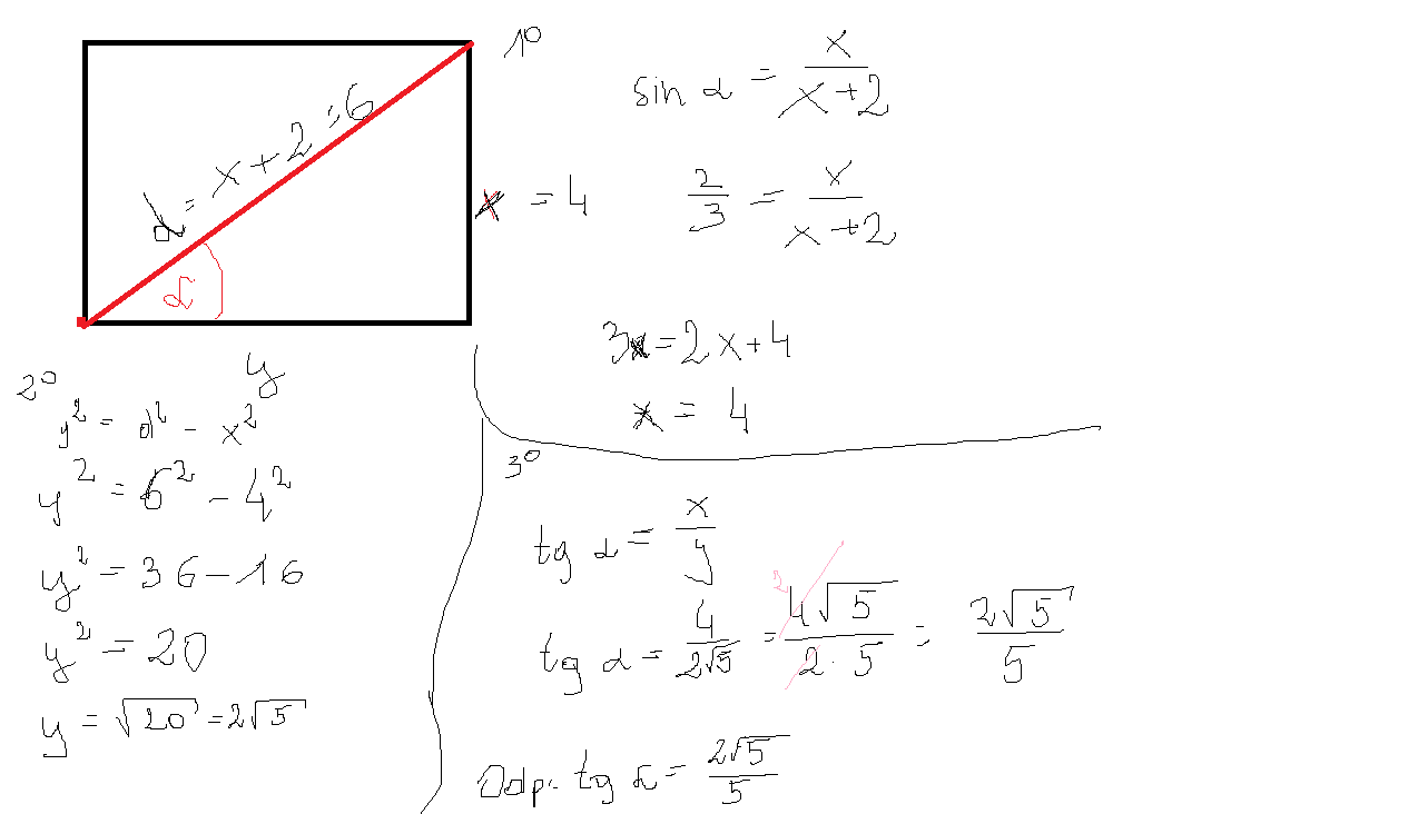 . Przekątna jest dłuższa od szerokości prostokąta o 2. Oblicz tg