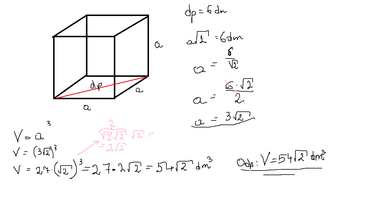 Oblicz objętość sześciana w którym przekątnae podstawy ma długość 6dm