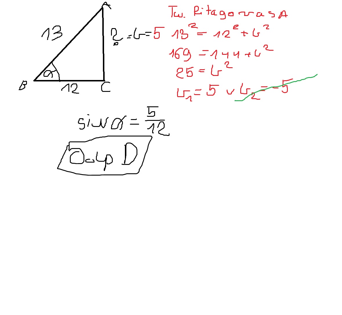 w trójkącie prostokątnym ABC o kącie prostym przy wierzchołku C i kącie ostrym alfa przy wierzchołku B dane sa długości AB=13 BC=12