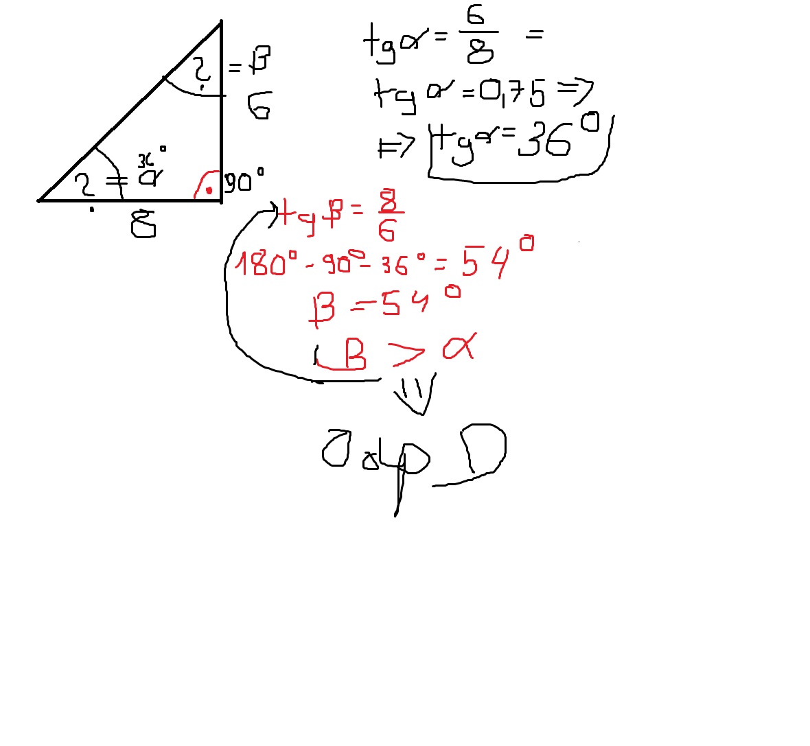w trójkącie prostokątnym o przyprostokątnych 6i8 tangens wiekszego kąta ostrego jest rowny ??
