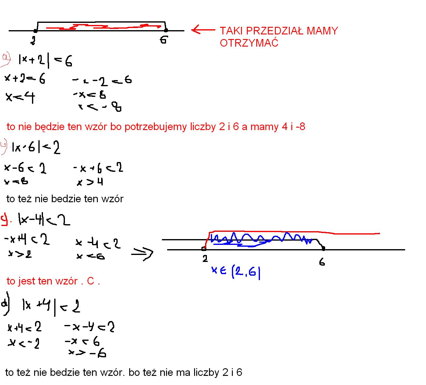 Wartość bezwzględna |x-a| oznacza odległość x od a. W przykładzie a) mamy więc odległość x od -2 i odległość ta ma być mniejsza od 6. Rysujemy więc oś, zaznaczamy punkt -2 i patrzymy, które liczby będą w odległości mniejszej niż 6 od zaznaczonego punktu - będą to liczby z przedziału (-8; 4). W ten sposób możemy sprawdzić każdy z podpunktów (lub rozwiazać tego typu zadanie) i porównać z przedziałem (2; 6).