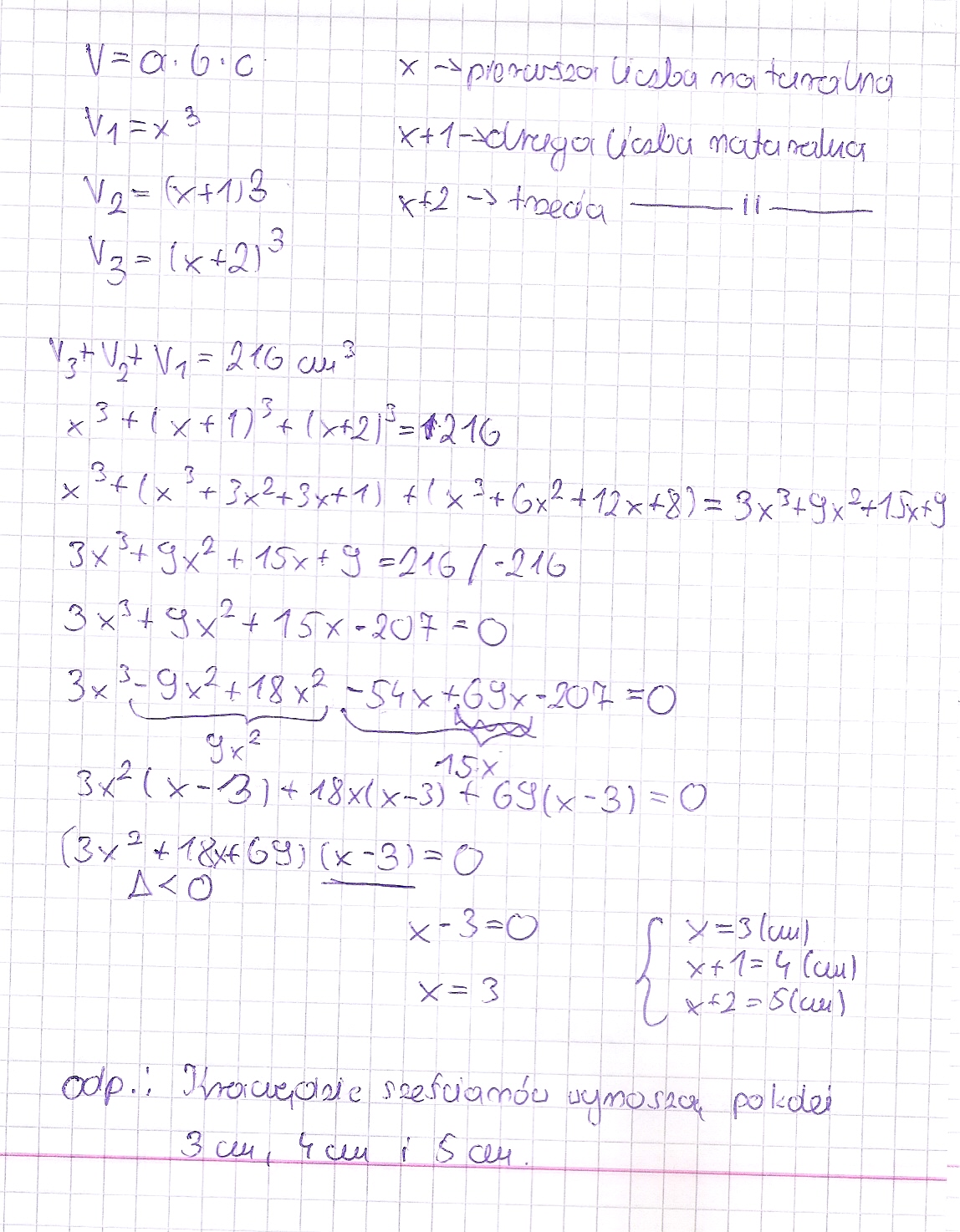. Wyznacz długości krawędzi tych sześcianów. Jeżeli wiesz, że są one trzema kolejnymi liczbami naturalnymi.