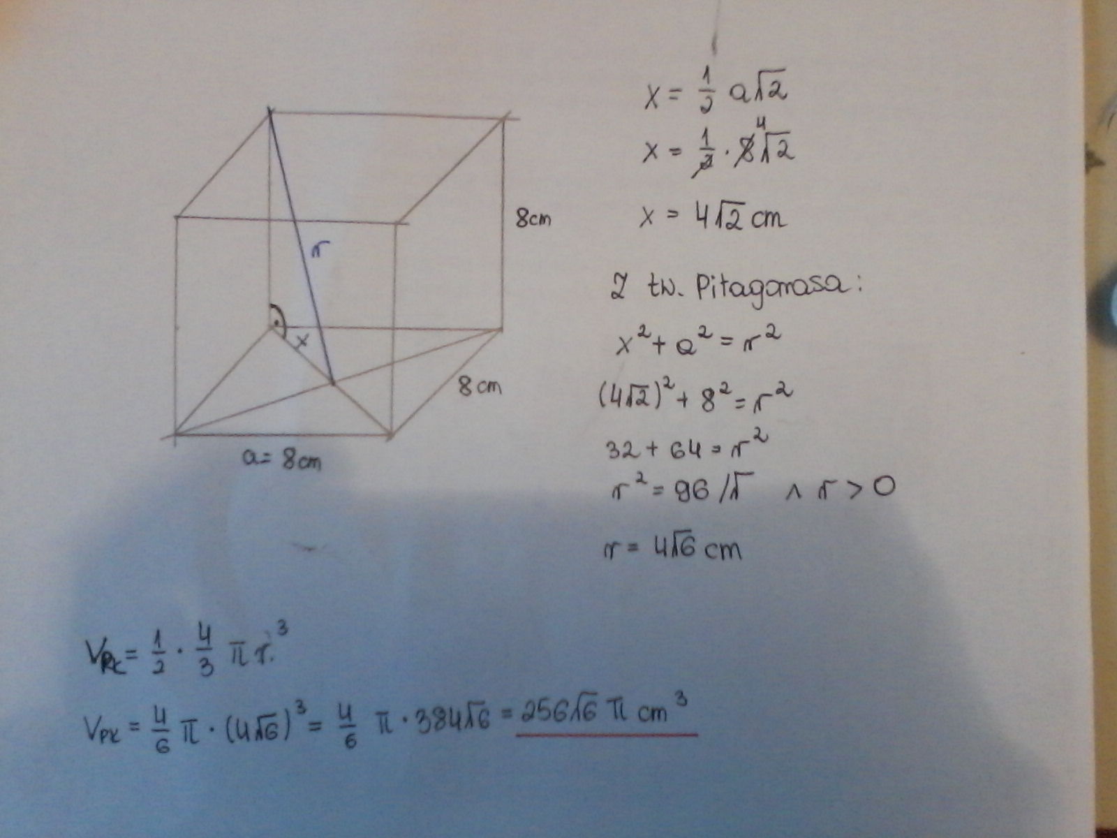 szklana pokrywa w kształcie półkuli przykrywa sześciany kawałek ciasta o krawędzi 8 cm(górne wieszchołki sześcianu dotykają pokrywy)Oblicz pojemność pokrywy.