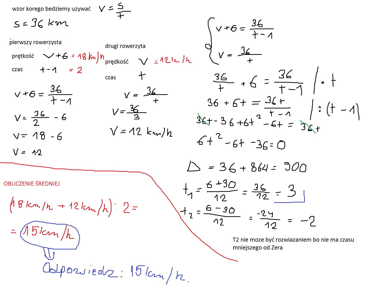 Dwaj rowerzyści wyjechali równocześnie na trasę długości 36 km.Predkość pierwszego rowerzysty była o 6km\h większa niż prędkość drugiego,więc pokonał on trasę w czasie o godzinę krótszym niż drugi